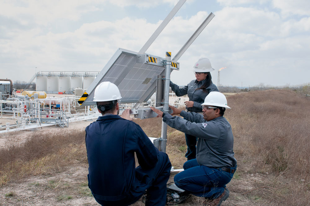 Dirk Richter (left), founder of Quanta3, inspects his company’s methane detection system at a Statoil well pad in Karnes County, Texas.