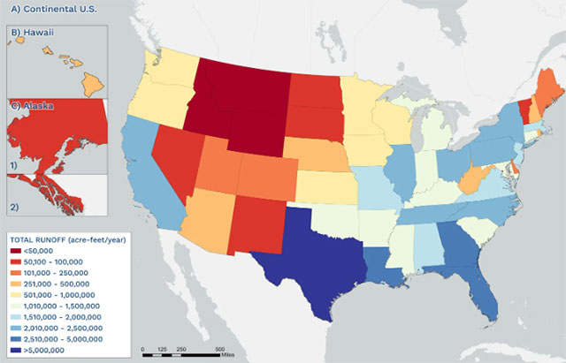 In this map, blue signifies higher amounts of annual stormwater runoff from urban areas, while red is lower. States with relatively large amounts of precipitation and large urban areas, like Texas and Florida, are getting much more stormwater runoff than Montana and Idaho, where there’s less precipitation and less urban coverage. But even if it could, a given state wouldn’t want to capture every drop of stormwater falling on its cities, as rain also needs to replenish nearby rivers and lakes to sustain ecosystems.