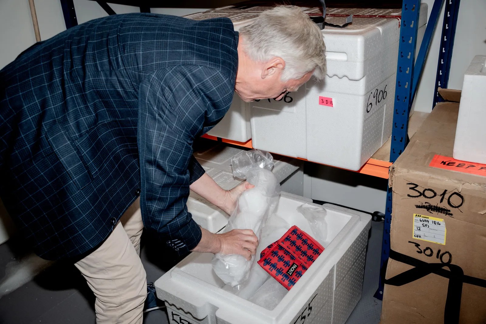 We head down a narrow basement hallway past old cabinets and a giant, dusty globe. Ditlevsen pulls open the heavy metal door of a walk-in freezer, and the air, at –20 degrees Celsius, slaps me in the face. On the right are shelves containing large polystyrene boxes. Inside them are chunks of ice cores, cut into segments about 55 centimeters long. Along the opposite wall is a metal workbench with ice-cutting tools. Without thinking, I rest my hand on it. My skin sticks to the metal.