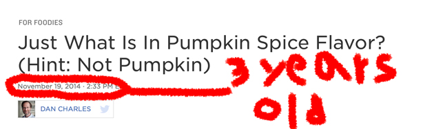 I thought, I can’t think why, that Starbucks would never lie. But boppity goddamn bop. Pumpkin spice is not pumpkin flavor.