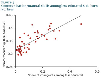If these patterns are driving the differences across states, then in states where immigration has been heavy, U.S.-born workers with less education should have shifted toward more communication-intensive jobs. Figure 3 shows exactly this….In states with a heavy concentration of less-educated immigrants, U.S.-born workers have migrated toward more communication-intensive occupations. Those jobs pay higher wages than manual jobs, so such a mechanism has stimulated the productivity of workers born in the United States and generated new employment opportunities.