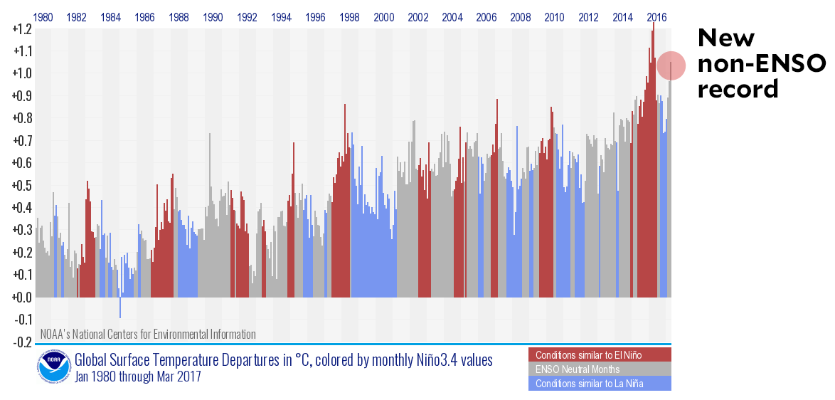 Well, the past couple of months have had neither. We have been “ENSO neutral,” in the jargon. And boy was it hot. According to NOAA, March 2017 marks “the first time a monthly temperature departure from average surpasses 1.0°C (1.8°F) in the absence of an El Niño episode in the tropical Pacific Ocean.”