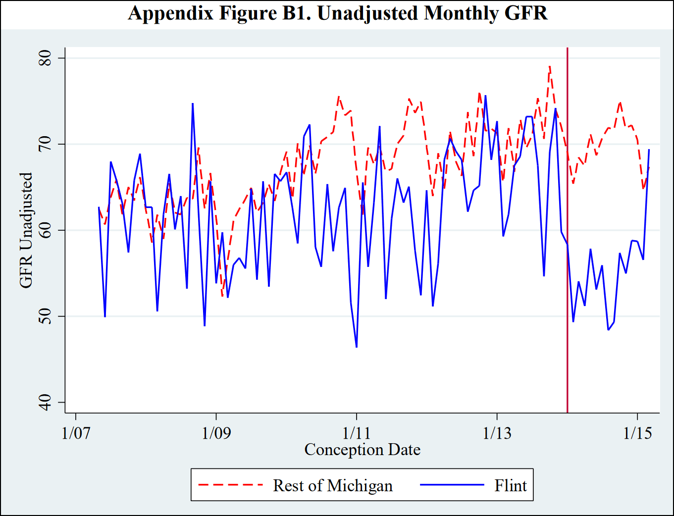 That’s a lot of noise all right. The problem is that Flint switched its water supply in April 2014, while the red line represents January 2014. This means that fertility dropped enormously from December 2013 to February 2014—and then nothing more happened. Women who conceived in November and were thus exposed to bad water for four months had high fertility rates, while women who conceived a month later and were exposed to bad water for five months had dramatically lower fertility rates. That’s a helluva response to one extra month of exposure.