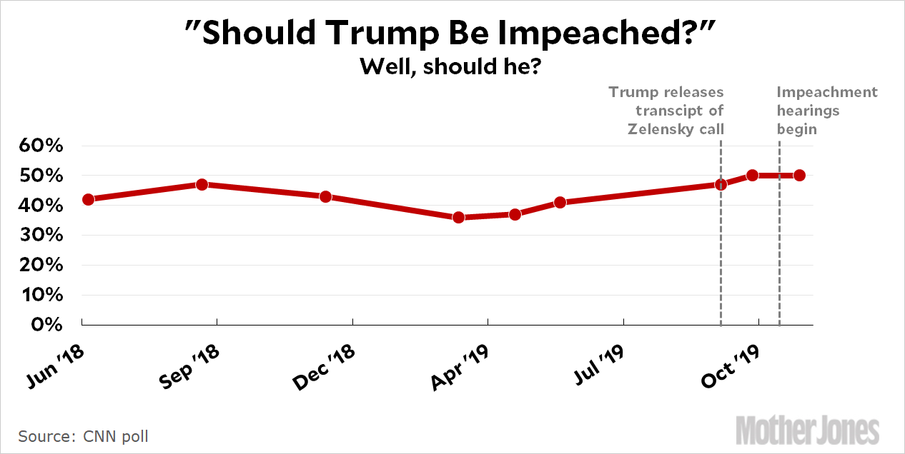 The crosstabs pretty much tell the story here. Roughly speaking, Democrats are 90 percent in favor of impeachment, Republicans are 90 percent against impeachment, and independents are split 50-50. As usual, Democratic and Republican leaners feel the same way as Democrats and Republicans, so the only truly undecided group is the tiny number of genuine indies in the middle. That’s maybe a tenth of the electorate or so, which means that public opinion just doesn’t have very far to move. The only way to change that is for something to become public that’s too heinous for even Fox News to paper over.