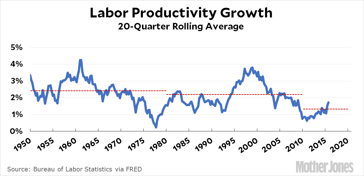 You may wonder why I care. A little marketing hype never hurt anyone, after all. The reason is that I believe AI will cause massive dislocations in the labor market, and we’d best get ready for them. One of the most common counterarguments, however, is that if AI robots were truly putting people out of work, then we’d see labor productivity going up. (Fewer people making more stuff = higher productivity.) But that’s not what we see: