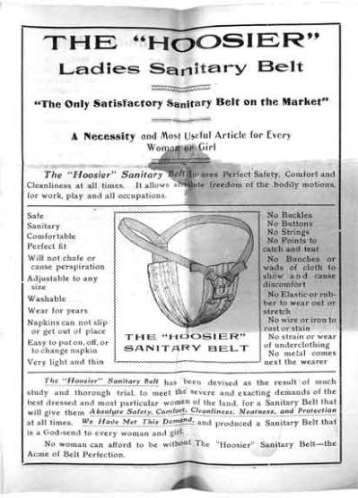 ~1925: From Indiana comes the gift of the Hoosier Ladies’ Sanitary Belt, a thick, washable cloth pad ladies attach to straps to form a diaperlike thing. (Comfort is key, after all.)