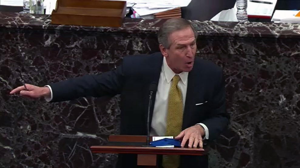 In this screenshot taken from a congress.gov webcast, Michael van der Veen, lawyer for former President Donald Trump, speaks at the second impeachment trial on February 12, 2021 in Washington, DC. congress.gov/Getty