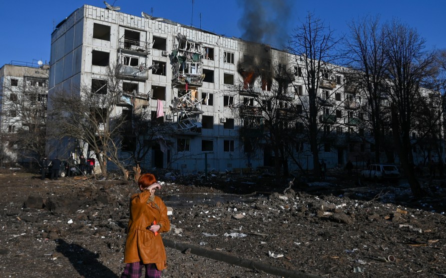 Explosions were seen across the country, even in the capital city of Kyiv—where a cacophony of gunfire and sirens backgrounded the fleeing of residents. Photos show the debris of buildings struck by rockets across the massive country, reports the Washington Post. “We are facing a war and horror,” 64-year-old Liudmila Gireyeva of Kyiv told the Associated Press. “What could be worse?”