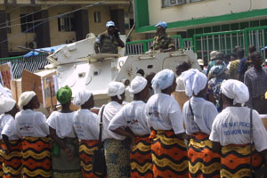 As a hundred Liberian women sat outside the peace hall in Ghana, war raged back in Liberia. International media picked up on the talks when Sierra Leone indicted Taylor for war crimes. Taylor fled back to Liberia, leaving the warlords to plan a transitional government. The women had been sitting outside every day for six weeks when they got news that the American embassy in Monrovia had been hit by a missile, killing several members of their families. Spurred into action, Gbowee sent for reinforcements, and the women physically blocked the rebel leaders from leaving the hall before making progress.