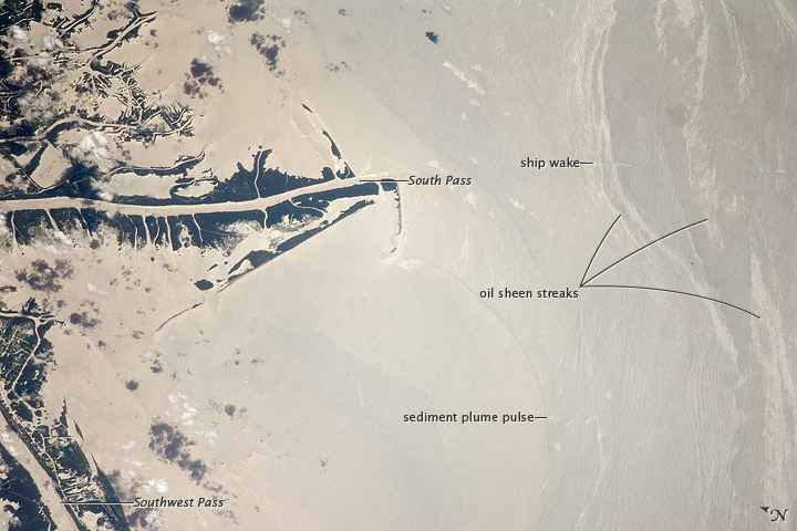 Oil Slick, Mississippi River Delta, Gulf of Mexico, an astronaut photo taken from the International Space Station, image courtesy NASA