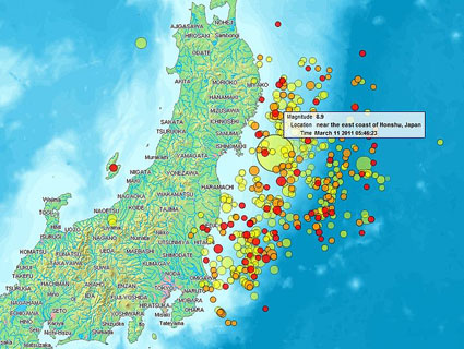 Map of the Sendai Earthquake 2011 and aftershocks.Credit: <a href="http://www.demis.nl/home/pages/home.htm">www2.demis.nl</a>
