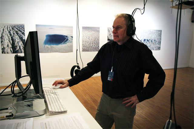 Jonathan Perl listens to one of his custom-built climate "sonifications."Tim McDonnell/Climate Desk