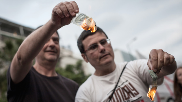Two men burn euro notes at a protest in Athens.Socrates Baltagiannis/DPA/ZUMA Wire
