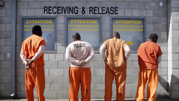 Prisoners from Sacramento County await processing after arriving at the Deuel Vocational Institution in Tracy, California.Rich Pedroncelli/AP