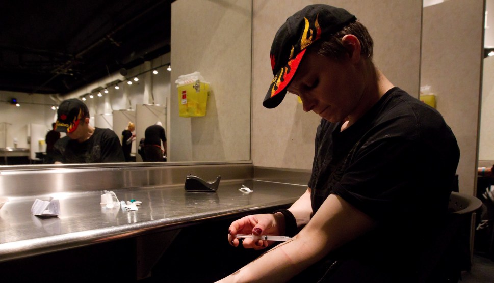 In an April 18, 2011, photo, a user injects morphine he bought on the street at the Insite safe injection clinic in Vancouver, British Columbia. AP