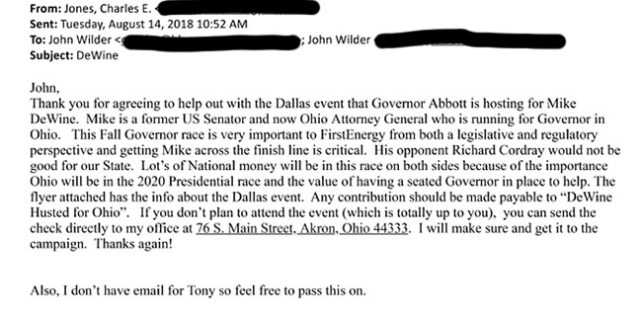 In this email, obtained by a public records request, then-FirstEnergy CEO Chuck Jones emphasized the importance of electing Mike DeWine in 2018. Jones has since been indicted on charges related to HB 6, the utility bailout bill Gov. DeWine signed in July 2019.