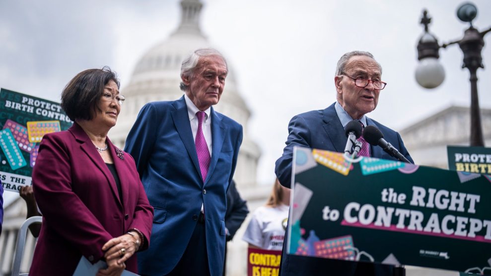 Senate Majority Leader Chuck Schumer (D-N.Y.) speaks with Sen. Mazie Hirono (D-Hawaii), far left, and Sen. Ed Markey (D-Mass.), center, during a news conference on the Right to Contraception Act in DC on Wednesday.Jabin Botsford/The Washington Post/Getty
