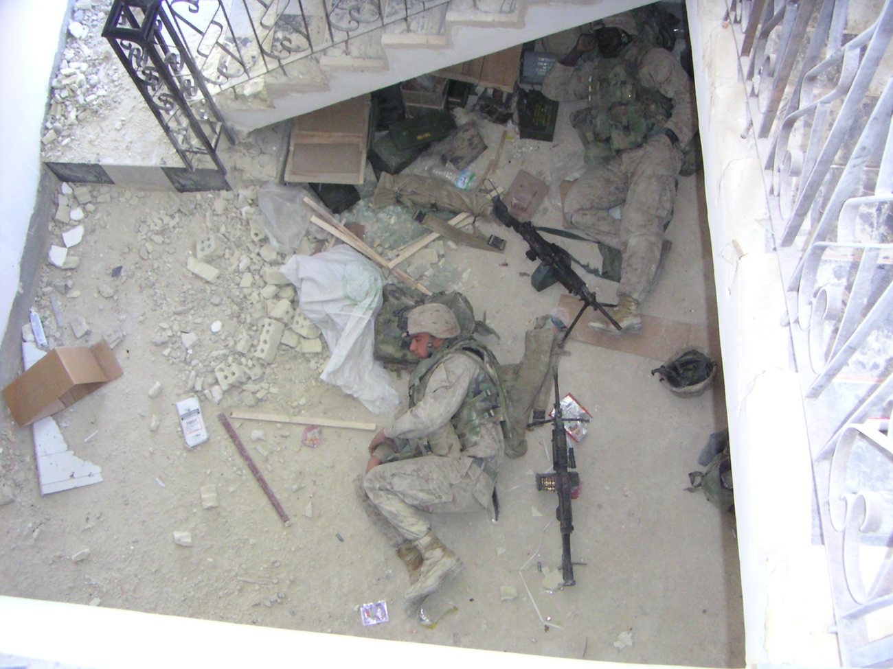 But as the ramp lowers, the slow creak of the metal door is all we hear. There is near-complete silence as we run to our assigned sectors of Fallujah’s government complex.
