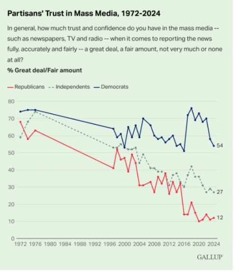 Back to the question of why trust in media is low. At the conference, there were crickets regarding the reason for this. A casual glance at the polling provides some insight. In 1972, according to Gallup, 72 percent of Democrats had a great deal or some trust in the media; 68 percent of Republicans felt the same way. Not much of a difference. Independents back then were the least trusting at 59 percent.
