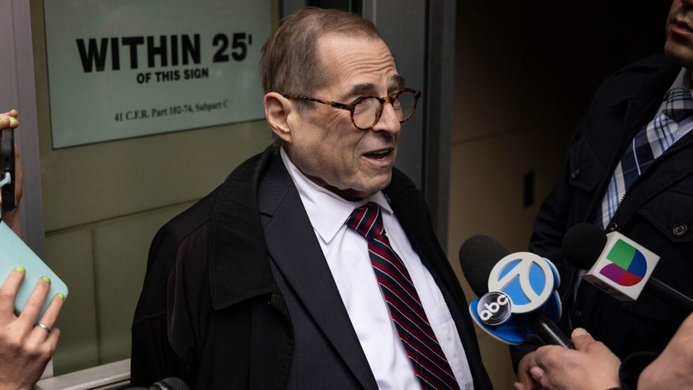The confrontation comes amid news reports that ICE has been arresting undocumented immigrants as they leave courthouses around the country. According to Gothamist, ICE officers allegedly threatened to arrest two people who were monitoring their activity at the Manhattan courthouse, and a Nadler staffer invited the advocates into the congressional office. In a statement provided to Mother Jones, a senior DHS official claimed police tried to enter the office based on a belief that protesters were inside and accused the woman who was handcuffed of blocking their way, alleging she “became verbally confrontational.” The DHS official said the woman was detained “for the purpose of completing the security check” of the office and was subsequently released “without further incident.” The unnamed staffer told Gothamist that “everything resolved” and declined to comment further.
